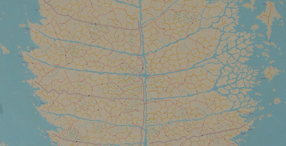On <A complete map of Leaf City>, Kwon painted veins as freeways and expressed other parts of leaves as smaller administrative districts. On <A map of the surrounding areas of Mt. Pupil>, he painted gentle contour lines as a round shape of a pupil and a disconnected road as a bloodshot eye. They look like maps because Kwon painted relations between the whole and small elements of the whole after he observed the whole part of nature (leaves) and human body parts (pupils, palms). While a map of a leaf or a pupil is formed naturally, <A map of Pizza Islands>, <A map of Bathing beach city>, and <A map of Flyswatter Peninsula> remind us of maps with methodically planned cities. A grip of a flyswatter became a straight stretch of freeways toward the flyswatter peninsula. Adopting a map format, Kwon describes elements and features of the objects. Adopting symbols of a map, he clearly shows us freeways-routes and planned cities-villages. If you look closer, you will be able to find words like ‘Oh dear’, ‘I wish you were dead’, ‘annoying’, ‘You are so annoying’, or ‘I am so tired of you’. These words are from his experience of catching a fly with a flyswatter. On <A map of Pizza Islands>, a whole pizza and a piece of a pizza were described as islands, and the stretching cheeses are small islands. Kwon named cutting lines of a pizza as freeways, lines of hot sauce as routes, and the edge of a pizza as ‘Flour conservation zone’. He also named mixed areas of sauce and cheese as ‘Complex areas’, and he named small villages after toppings’ names, such as olives, corns, and peas.